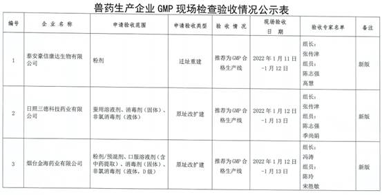 根据《兽药生产质量管理规范(2020年修订)》、农业农村部第292号公告,依照《兽药生产质量管理规范检查验收办法》等有关规定,山东省畜牧兽医局派出检查组对泰安豪信康达生物有限公司、日照三德科技药业有限公司、烟台金海药业有限公司、烟台只楚制药有限公司、山东友成生物科技有限公司、山东天宇生物科技有限公司、山东佳蕴德生物科技有限公司、山东爱得动物药业有限公司、山东金瑞生物科技有限公司、山东博瑞科生物技术有限责任公司、山东滨州沃华生物工程有限公司等11家兽药生产企业实施兽药GMP的情况进行现场检查验收,现将现场检查验收情况在山东省畜牧兽医局官网上予以公示,公示时间为2022年1月18日至2022年2月1日,请将意见和建议反馈给山东省畜牧兽医局政策法规处(行政许可处)。