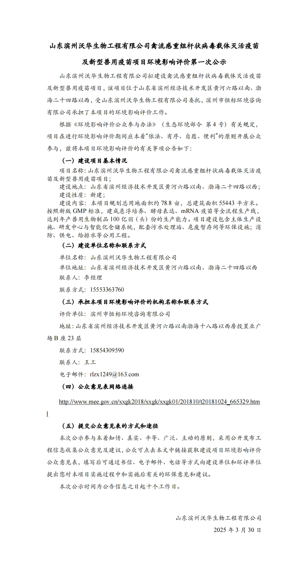 山东滨州沃华生物工程有限公司禽流感重组杆状病毒载体灭活疫苗 及新型兽用疫苗项目环境影响评价第一次公示