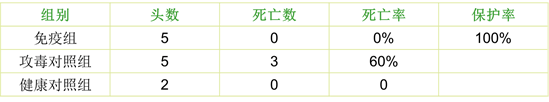 1. A组免疫组5头均未出现异常,未死亡,保护率达100%;B组攻毒对照组5头均在攻毒后18h出现发烧,采食量下降,精神沉郁等症状,且在攻毒后第3天、第5天、第6天各死亡一头,死亡离60%;C组2头均无任何异常。