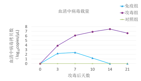 免疫组在攻毒后第7天血清中平均病毒拷贝数为102.4copies/μL,之后下降,到第14天血清中已无蓝耳病毒;攻毒组血清中病毒拷贝数在14天之前处于一个上升趋势,达到107.5copies/μL。健康对照组血清中病毒拷贝数一直处于0。