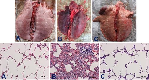 攻毒后21天对试验猪进行剖杀,观察病理变化,并对肺脏进行组织病理切片评估。结果免疫组A所有脏器(包括肺脏)均无异常,攻毒组B肺脏出现实变,其它脏器无异常,健康对照组C无异常;肺脏组织病理切片显示免疫组A和健康对照组C无异常,攻毒对照组B出现较为严重的肺间质增宽。