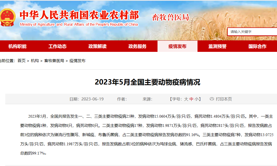 2023年5月,全国共报告发生一、二、三类主要动物疫病25种,发病动物15.0604万头/羽/只/匹,病死动物1.4804万头/羽/只/匹。其中,一类主要动物疫病1种,发病动物8只,病死动物0只。二类主要动物疫病17种,发病动物1.9871万头/羽/只/匹,病死动物2817头/羽/只/匹,报告发病数占前3位的病种依次为猪流行性腹泻、新城疫、布鲁氏菌病,占二类主要动物疫病报告发病总数的91.16%。三类主要动物疫病7种,发病动物13.0725万头/羽/只/匹,病死动物1.1987万头/羽/只/匹,报告发病数占前3位的病种依次为鸡球虫病、猪流感、巴氏杆菌病,占三类主要动物疫病报告发病总数的99.17%。