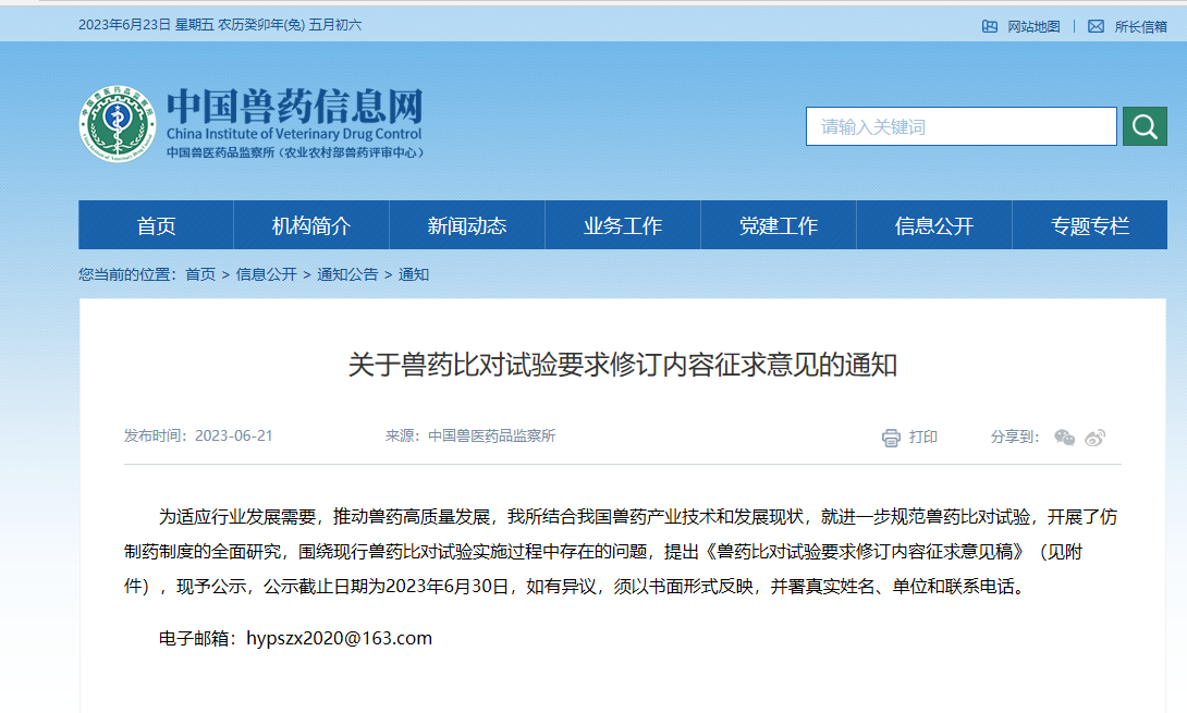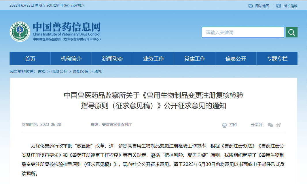 兽用生物制品变更注册复核检验指导原则(征求意见稿)为进一步规范兽用生物制品注册复核检验工作,切实提高变更注册复核检验工作质效,按照深化兽药行政审批“放管服”改革要求,根据《兽药注册办法》《兽药注册分类及注册资料要求》和《兽药注册评审工作程序》等有关规定,特制定本指导原则。一、本指导原则适用于兽用生物制品变更注册需要进行评审事项,主要包括增加靶动物、变更兽药含量规格、改变兽药生产工艺、修改兽药注册