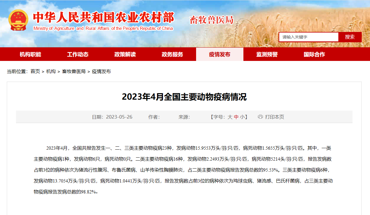 2023年4月,全国共报告发生一、二、三类主要动物疫病23种,发病动物15.9553万头/羽/只/匹,病死动物1.5655万头/羽/只/匹。其中,一类主要动物疫病1种,发病动物6只,病死动物0只。二类主要动物疫病16种,发病动物2.2493万头/羽/只/匹,病死动物5214头/羽/只/匹,报告发病数占前3位的病种依次为猪流行性腹泻、布鲁氏菌病、山羊传染性胸膜肺炎,占二类主要动物疫病报告发病总数的95.53%。三类主要动物疫病6种,发病动物13.7054万头/羽/只/匹,病死动物1.0441万头/羽/只/匹,报告发病数占前3位的病种依次为鸡球虫病、猪流感、巴氏杆菌病,占三类主要动物疫病报告发病总数的98.82%。