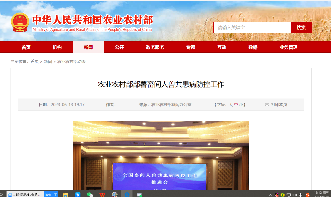 6月13日,农业农村部在河南省三门峡市召开全国畜间人兽共患病防控工作推进会,深入贯彻党的二十大和中央农村工作会议精神,全面分析畜间人兽共患病防控面临的形势,部署下一阶段防控重点任务。农业农村部副部长马有祥出席会议并讲话。