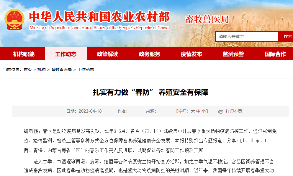 扎实有力做“春防”养殖安全有保障编者按:春季是动物疫病易发高发期,每年3-5月,各省(市、区)陆续集中开展春季重大动物疫病防控工作,通过强制免疫、疫情监测、检疫监管等多种方式全方位保障畜禽养殖健康安全发展。本报特别推出专题报道,分享四川、山东、广西、青海、内蒙古等省(区)的春防工作亮点及进展,以期促进各地春防工作顺利开展。进入春季,气温逐渐回暖,病毒、细菌等各种病原微生物开始复苏活跃,加之春季气温不
