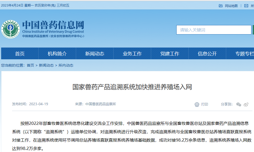 国家兽药产品追溯系统加快推进养殖场入网来源:中国兽医药品监察所 按照2022年部畜牧兽医系统信息化建设交流会工作安排,中国兽医药品监察所与全国畜牧兽医总站及国家兽药产品追溯信息系统(以下简称“追溯系统”)运维单位协调,对追溯系统进行升级改造,完成追溯系统与全国畜牧兽医总站养殖场直联直报系统对接工作,在追溯系统使用环节调用总站养殖场直联直报系统养殖场基础数据,成功对接98.2万余条信息,追溯系统养殖场入