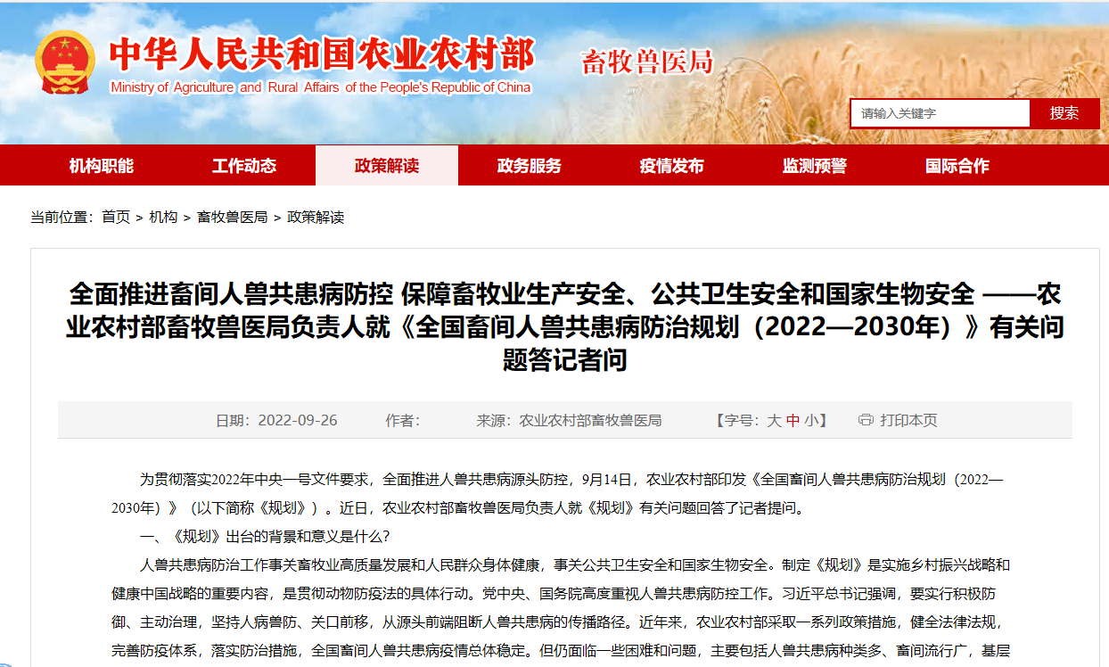 全面推进畜间人兽共患病防控 保障畜牧业生产安全、公共卫生安全和国家生物安全——农业农村部畜牧兽医局负责人就《全国畜间人兽共患病防治规划(2022—2030年)》有关问题答记者问 为贯彻落实2022年中央一号文件要求,全面推进人兽共患病源头防控,9月14日,农业农村部印发《全国畜间人兽共患病防治规划(2022—2030年)》(以下简称《规划》)。近日,农业农村部畜牧兽医局负责人就《规划》有关问题回答了记者提问。 一、