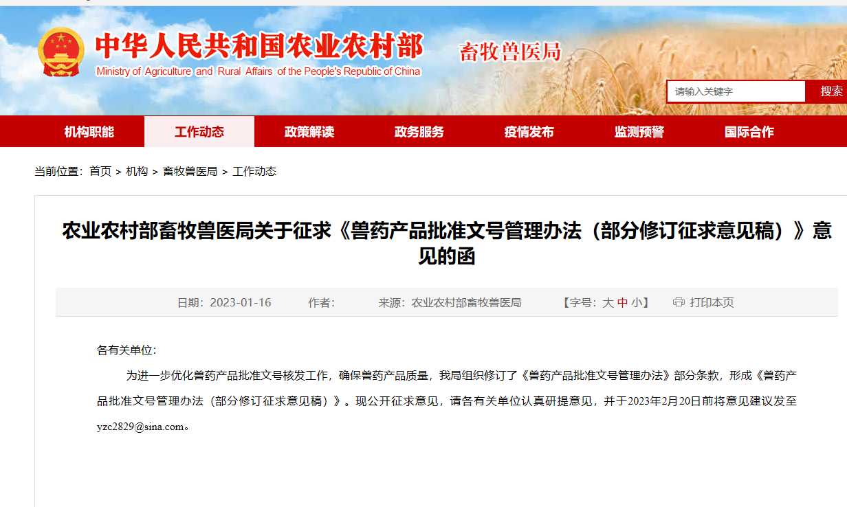 农业农村部畜牧兽医局关于征求《兽药产品批准文号管理办法(部分修订征求意见稿)》意见的函
