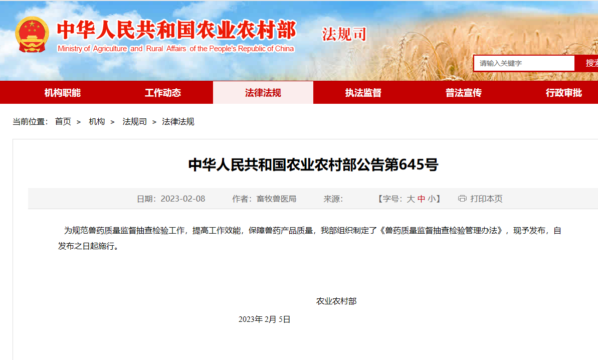 兽药质量监督抽查检验管理办法第一章 总 则 第一条 为规范兽药质量监督抽查检验工作,根据《中华人民共和国农产品质量安全法》《兽药管理条例》,制定本办法。 第二条 农业农村主管部门在中华人民共和国境内组织开展兽药质量监督抽查检验相关工作,适用本办法。 兽药质量监督抽查检验是落实兽药监督管理的重要措施,应当遵循科学、规范、合法、公正的基本原则。 第三条 农业农村部负责组织全国兽药质量监督抽查检验工作,制定国