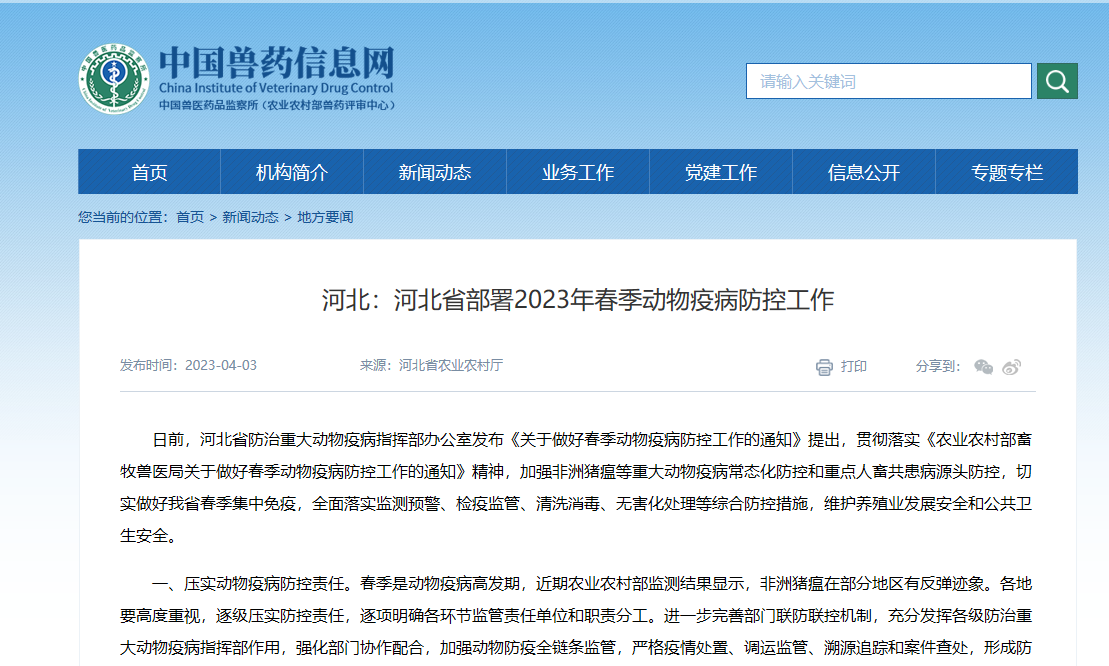 河北:河北省部署2023年春季动物疫病防控工作 日前,河北省防治重大动物疫病指挥部办公室发布《关于做好春季动物疫病防控工作的通知》提出,贯彻落实《农业农村部畜牧兽医局关于做好春季动物疫病防控工作的通知》精神,加强非洲猪瘟等重大动物疫病常态化防控和重点人畜共患病源头防控,切实做好我省春季集中免疫,全面落实监测预警、检疫监管、清洗消毒、无害化处理等综合防控措施,维护养殖业发展安全和公共卫生安全。一、压