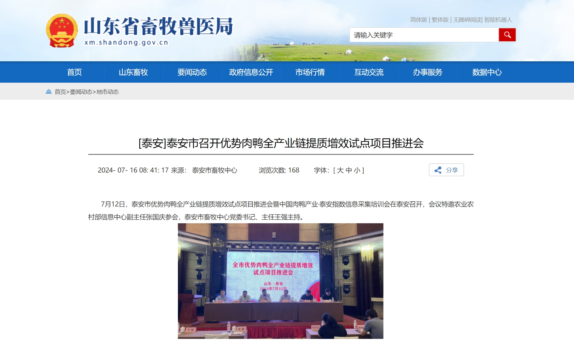 7月12日,泰安市优势肉鸭全产业链提质增效试点项目推进会暨中国肉鸭产业·泰安指数信息采集培训会在泰安召开,会议特邀农业农村部信息中心副主任张国庆参会,泰安市畜牧中心党委书记、主任王强主持。