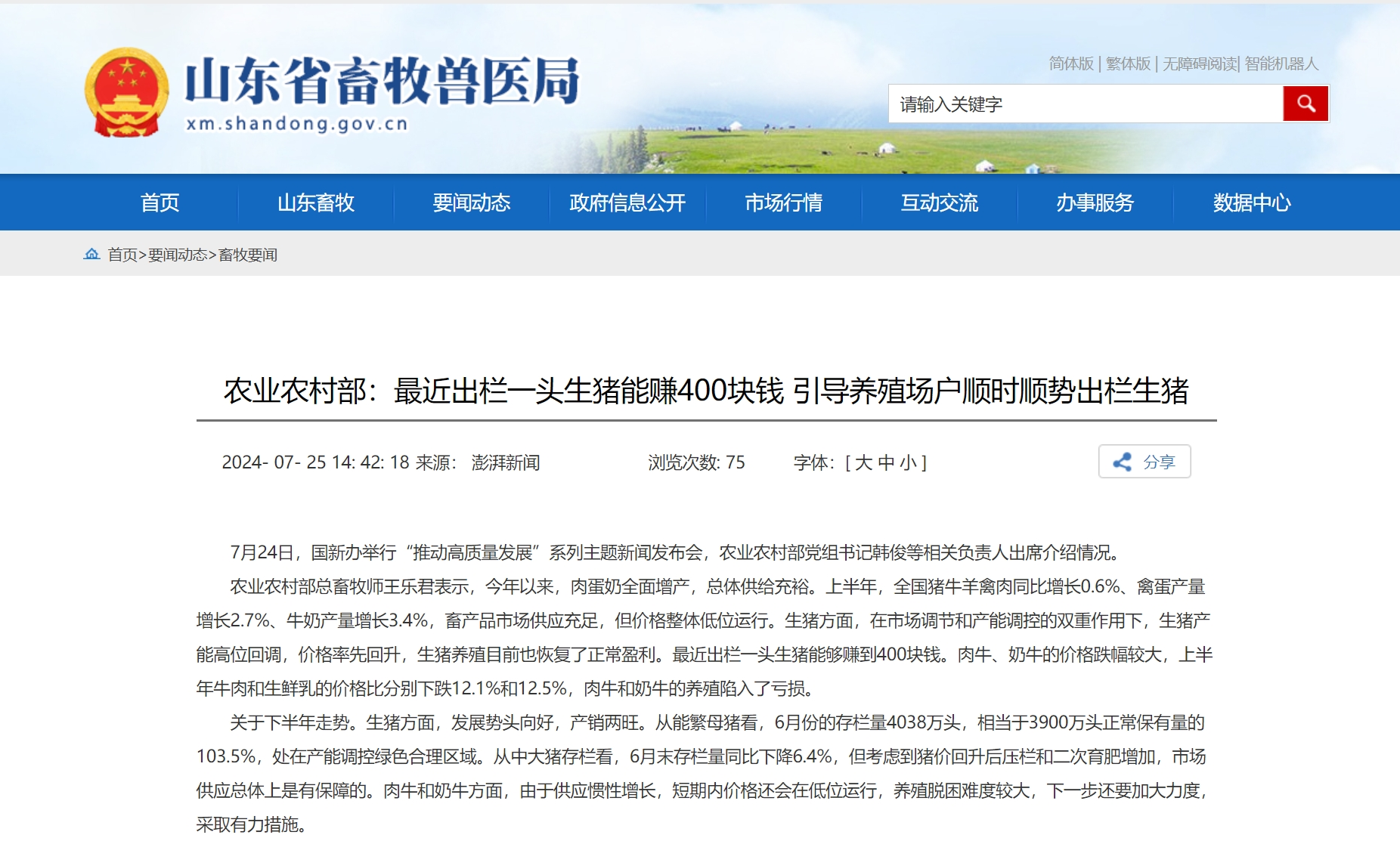 农业农村部总畜牧师王乐君表示,今年以来,肉蛋奶全面增产,总体供给充裕。上半年,全国猪牛羊禽肉同比增长0.6%、禽蛋产量增长2.7%、牛奶产量增长3.4%,畜产品市场供应充足,但价格整体低位运行。生猪方面,在市场调节和产能调控的双重作用下,生猪产能高位回调,价格率先回升,生猪养殖目前也恢复了正常盈利。最近出栏一头生猪能够赚到400块钱。肉牛、奶牛的价格跌幅较大,上半年牛肉和生鲜乳的价格比分别下跌12.1%和12.5%,肉牛和奶牛的养殖陷入了亏损。