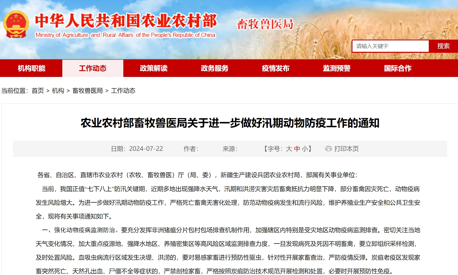 农业农村部畜牧兽医局关于进一步做好汛期动物防疫工作的通知
