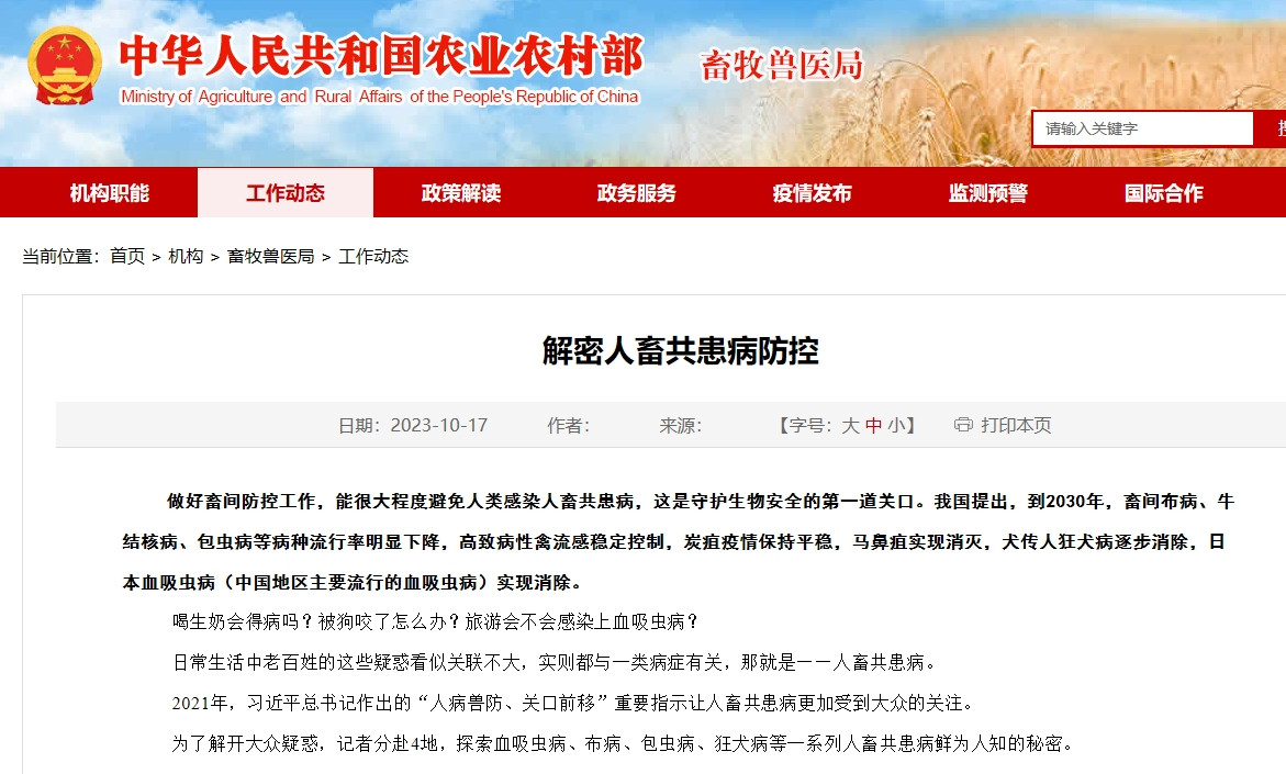 解密人畜共患病防控做好畜间防控工作,能很大程度避免人类感染人畜共患病,这是守护生物安全的第一道关口。我国提出,到2030年,畜间布病、牛结核病、包虫病等病种流行率明显下降,高致病性禽流感稳定控制,炭疽疫情保持平稳,马鼻疽实现消灭,犬传人狂犬病逐步消除,日本血吸虫病(中国地区主要流行的血吸虫病)实现消除。喝生奶会得病吗?被狗咬了怎么办?旅游会不会感染上血吸虫病?日常生活中老百姓的这些疑惑看似关联不大,