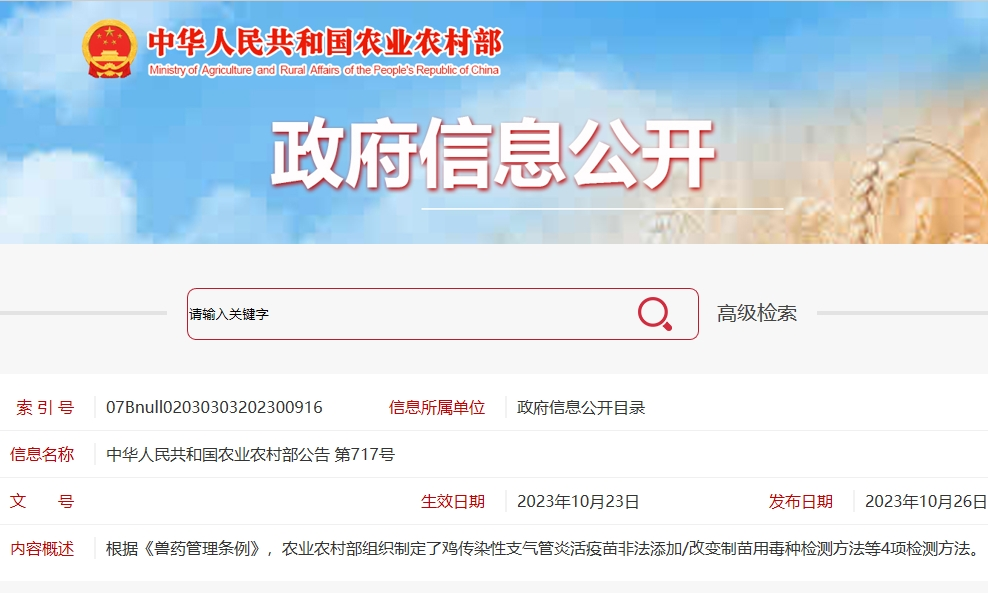 根据《兽药管理条例》,农业农村部组织制定了鸡传染性支气管炎活疫苗非法添加/改变制苗用毒种检测方法等4项检测方法,现予发布,自发布之日起执行。