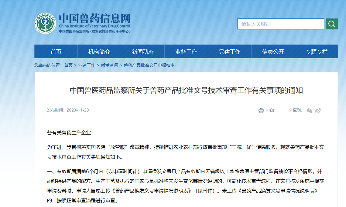 中国兽医药品监察所关于兽药产品批准文号技术审查工作有关事项的通知各有关兽药生产企业: 为了进一步贯彻落实国务院“放管服”改革精神,持续推进农业农村部行政审批事项“三减一优”便民服务,现就兽药产品批准文号技术审查工作有关事项通知如下。一、有效期届满前6个月内(以申请时间计)申请换发文号且产品有效期内无省级以上畜牧兽医主管部门监督抽检不合格情形,并能够提供产品的配方、生产工艺及执行的国家质量标准均未发