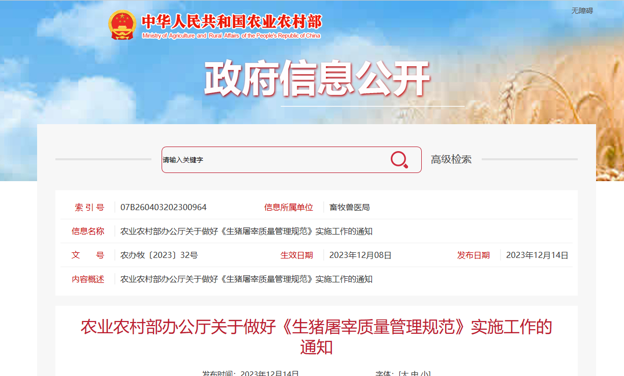 农业农村部办公厅关于做好《生猪屠宰质量管理规范》实施工作的通知各省、自治区、直辖市农业农村(农牧)、畜牧兽医厅(局、委),新疆生产建设兵团农业农村局:《生猪屠宰质量管理规范》(农业农村部公告第710号,以下简称《规范》)已于2023年9月12日公布,自2024年1月1日起施行。为切实做好《规范》实施工作,现就有关事项通知如下。一、提高思想认识,做好组织部署工作(一)加强组织领导。《规范》是从事生猪屠宰活动应遵循