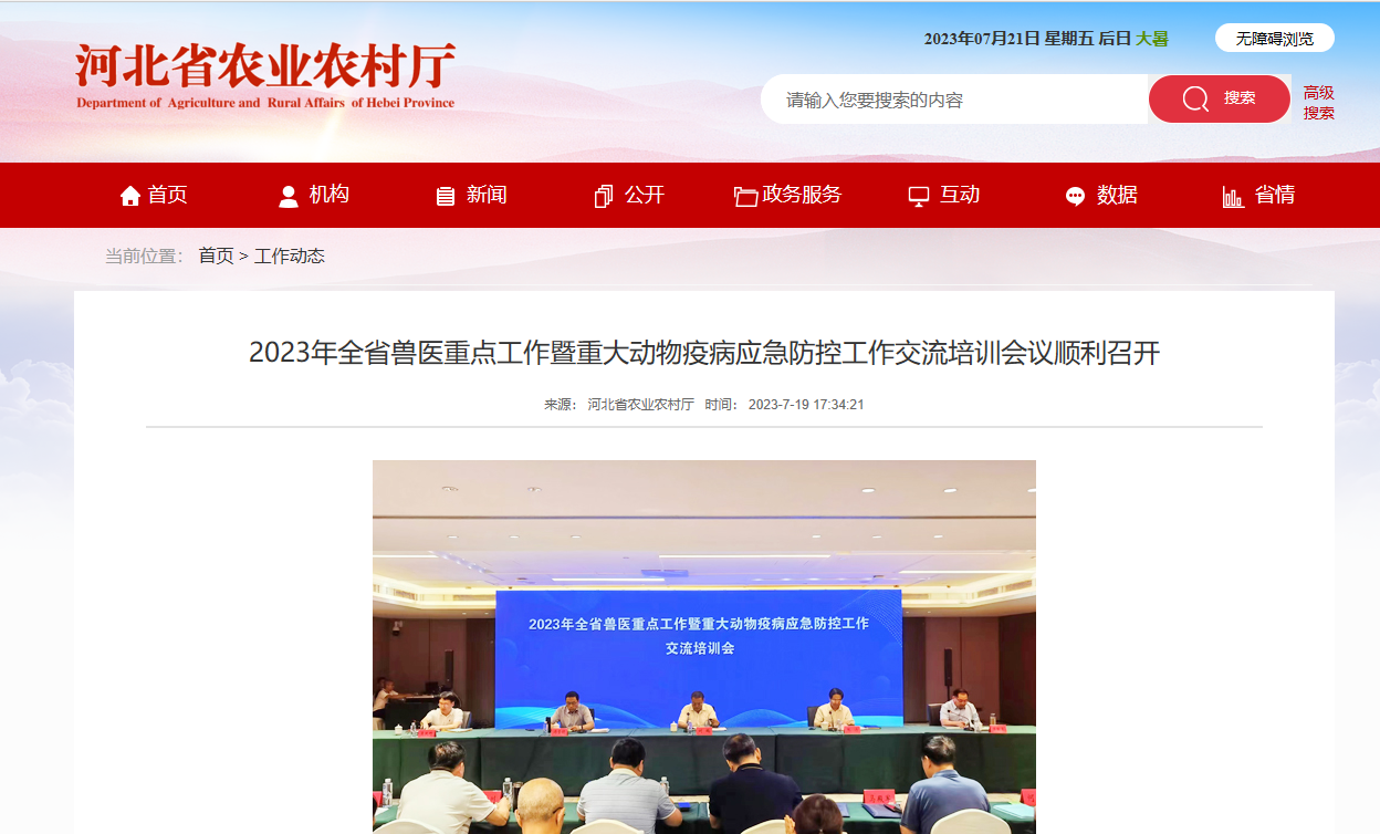 2023年全省兽医重点工作暨重大动物疫病应急防控工作交流培训会议顺利召开 来源: 河北省农业农村厅 时间: 2023-7-19 17:34:21 为总结2023年上半年全省兽医重点工作和重大动物疫病应急防控工作情况,研究部署下半年工作,7月18日~19日,河北省农业农村厅在定州市召开全省兽医重点工作暨重大动物疫病应急防控工作交流培训会议。河北省农业农村厅副厅长刘飚出席会议并讲话,定州市委书记张涛致辞。会议由省农业农村厅二级巡视员冯雪