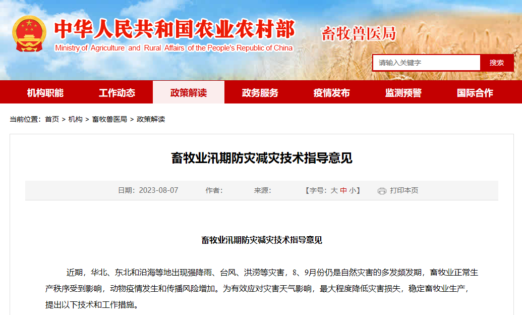 畜牧业汛期防灾减灾技术指导意见 近期,华北、东北和沿海等地出现强降雨、台风、洪涝等灾害,8、9月份仍是自然灾害的多发频发期,畜牧业正常生产秩序受到影响,动物疫情发生和传播风险增加。为有效应对灾害天气影响,最大程度降低灾害损失,稳定畜牧业生产,提出以下技术和工作措施。(一)加强灾害监测预警和物资储备。加强重大天气变化预判预警,充分利用广播电视、短信微信、乡村大喇叭等手段,及时发布预警信息和防灾减灾技