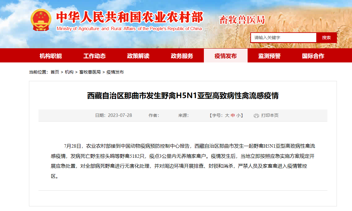 西藏自治区那曲市发生野禽H5N1亚型高致病性禽流感疫情日期:2023-07-28作者:来源:【字号:大 中 小】打印本页 7月28日,农业农村部接到中国动物疫病预防控制中心报告,西藏自治区那曲市发生一起野禽H5N1亚型高致病性禽流感疫情,发病死亡野生棕头鸥等野禽5182只,疫点3公里内无养殖家禽户。疫情发生后,当地立即按照应急实施方案规定开展应急处置,对全部病死野禽进行无害化处理,并对周边环境开展排查、封锁和消杀,严禁人员及