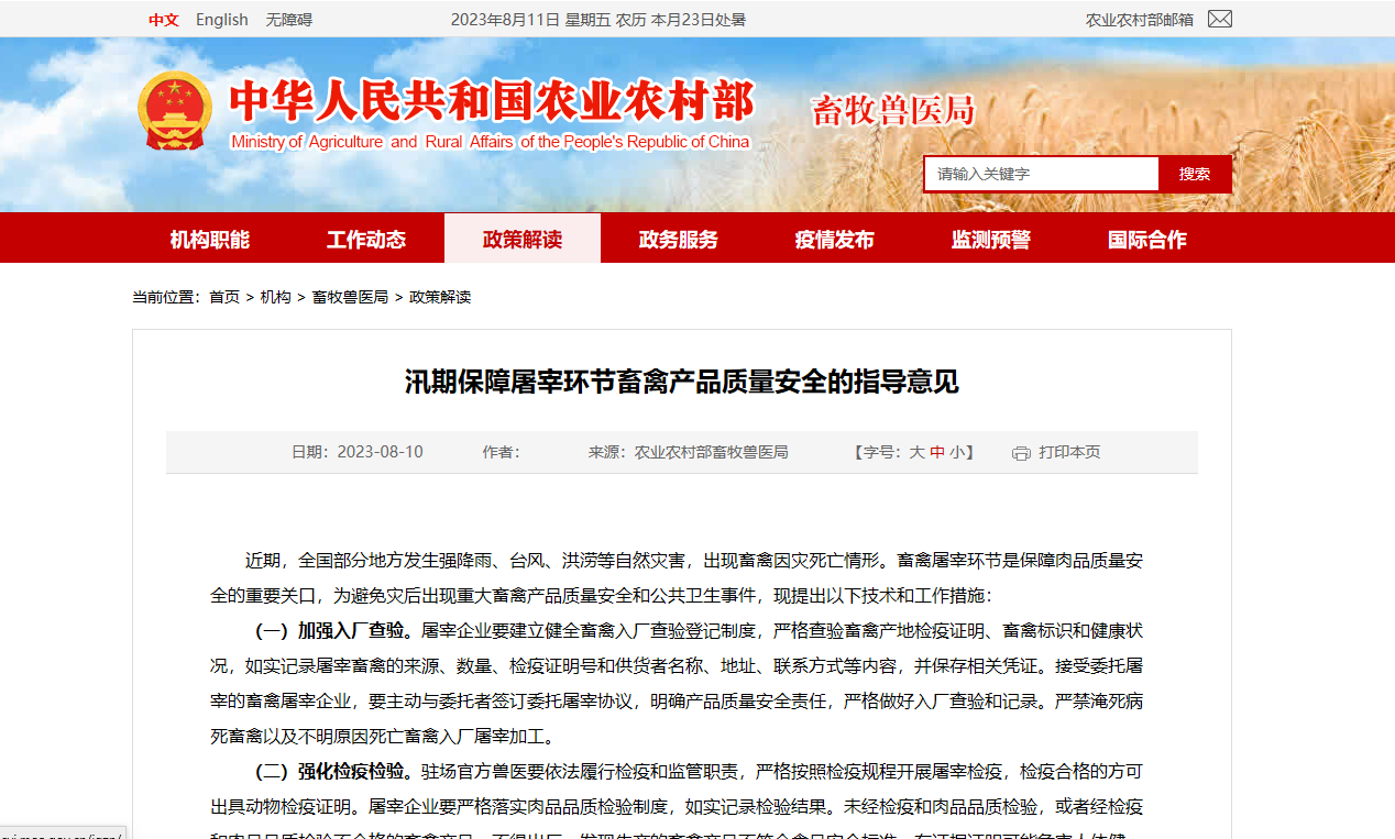 汛期保障屠宰环节畜禽产品质量安全的指导意见近期,全国部分地方发生强降雨、台风、洪涝等自然灾害,出现畜禽因灾死亡情形。畜禽屠宰环节是保障肉品质量安全的重要关口,为避免灾后出现重大畜禽产品质量安全和公共卫生事件,现提出以下技术和工作措施:(一)加强入厂查验。屠宰企业要建立健全畜禽入厂查验登记制度,严格查验畜禽产地检疫证明、畜禽标识和健康状况,如实记录屠宰畜禽的来源、数量、检疫证明号和供货者名称、地址