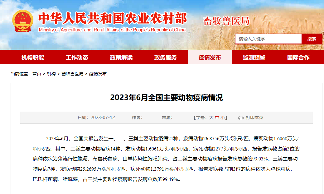2023年6月全国主要动物疫病情况2023年6月,全国共报告发生一、二、三类主要动物疫病21种,发病动物26.8756万头/羽/只/匹,病死动物1.6068万头/羽/只/匹。其中,二类主要动物疫病14种,发病动物1.6061万头/羽/只/匹,病死动物2277头/羽/只/匹,报告发病数占前3位的病种依次为猪流行性腹泻、布鲁氏菌病、山羊传染性胸膜肺炎,占二类主要动物疫病报告发病总数的93.03%。三类主要动物疫病7种,发病动物25.2695万头/羽/只/匹,病死动物
