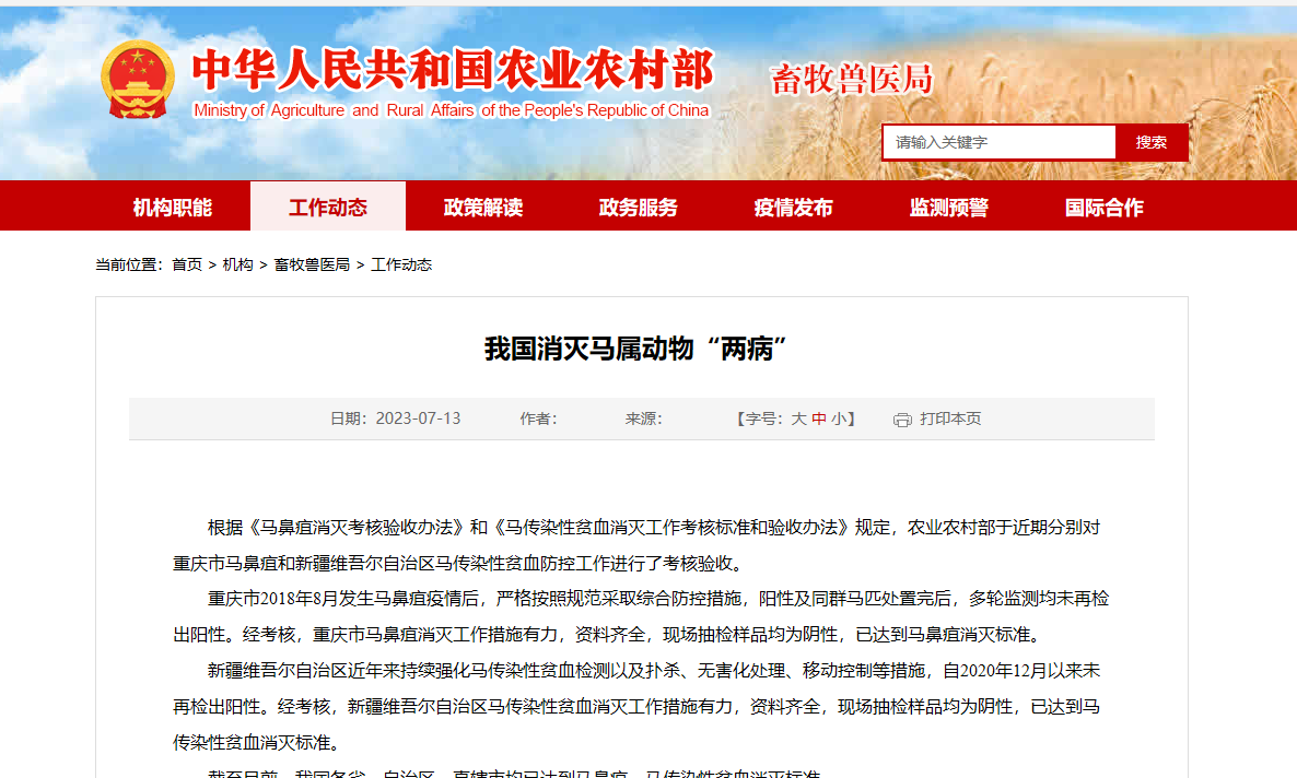 我国消灭马属动物“两病” 根据《马鼻疽消灭考核验收办法》和《马传染性贫血消灭工作考核标准和验收办法》规定,农业农村部于近期分别对重庆市马鼻疽和新疆维吾尔自治区马传染性贫血防控工作进行了考核验收。 重庆市2018年8月发生马鼻疽疫情后,严格按照规范采取综合防控措施,阳性及同群马匹处置完后,多轮监测均未再检出阳性。经考核,重庆市马鼻疽消灭工作措施有力,资料齐全,现场抽检样品均为阴性,已达到马鼻疽消灭标